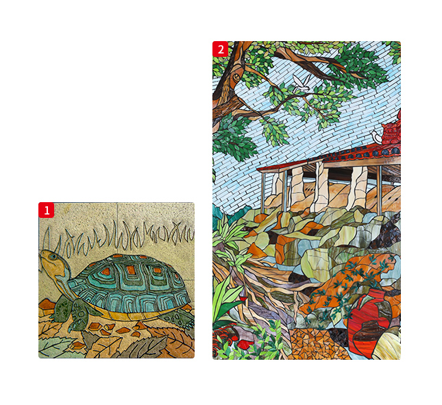 駅舎に沖縄らしさを表現するために、駅にちなんだアートガラスや、沖縄の動植物などをイメージしたアートタイル を設置しています。各駅ごとに違うアートデザインをぜひお楽しみください。