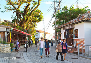 壺屋やちむん通り優しい風情ある焼き物の里 「壺屋」。平和通りを抜けた辺りから、ひめゆり通りまで続く壺屋は300年の歴史がある。石畳風に整備された通り沿いには陶芸工房や焼物の直売店、ギャラリーが並ぶ。
