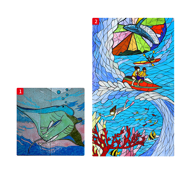 駅舎に沖縄らしさを表現するために、駅にちなんだアートガラスや、沖縄の動植物などをイメージしたアートタイル を設置しています。各駅ごとに違うアートデザインをぜひお楽しみください。