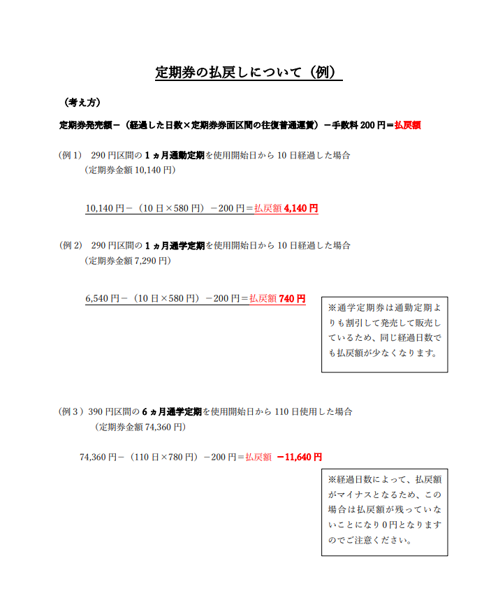 購入額 -(利用区間の往復普通旅客運賃×経過日数)- 手数料200円 = 払戻額