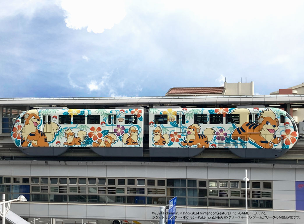 紅型やハイビスカスを背景にガーディが踊るように遊びまわっている様子が描かれたラッピング列車