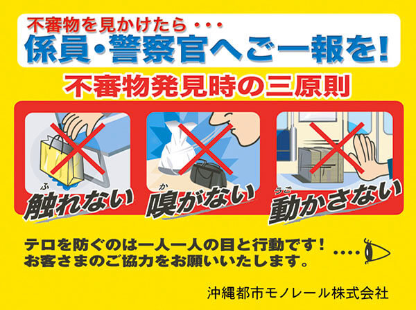 駅構内や車両などで不審物・不審者を発見したら、直ちに係員または警察へお知らせください。